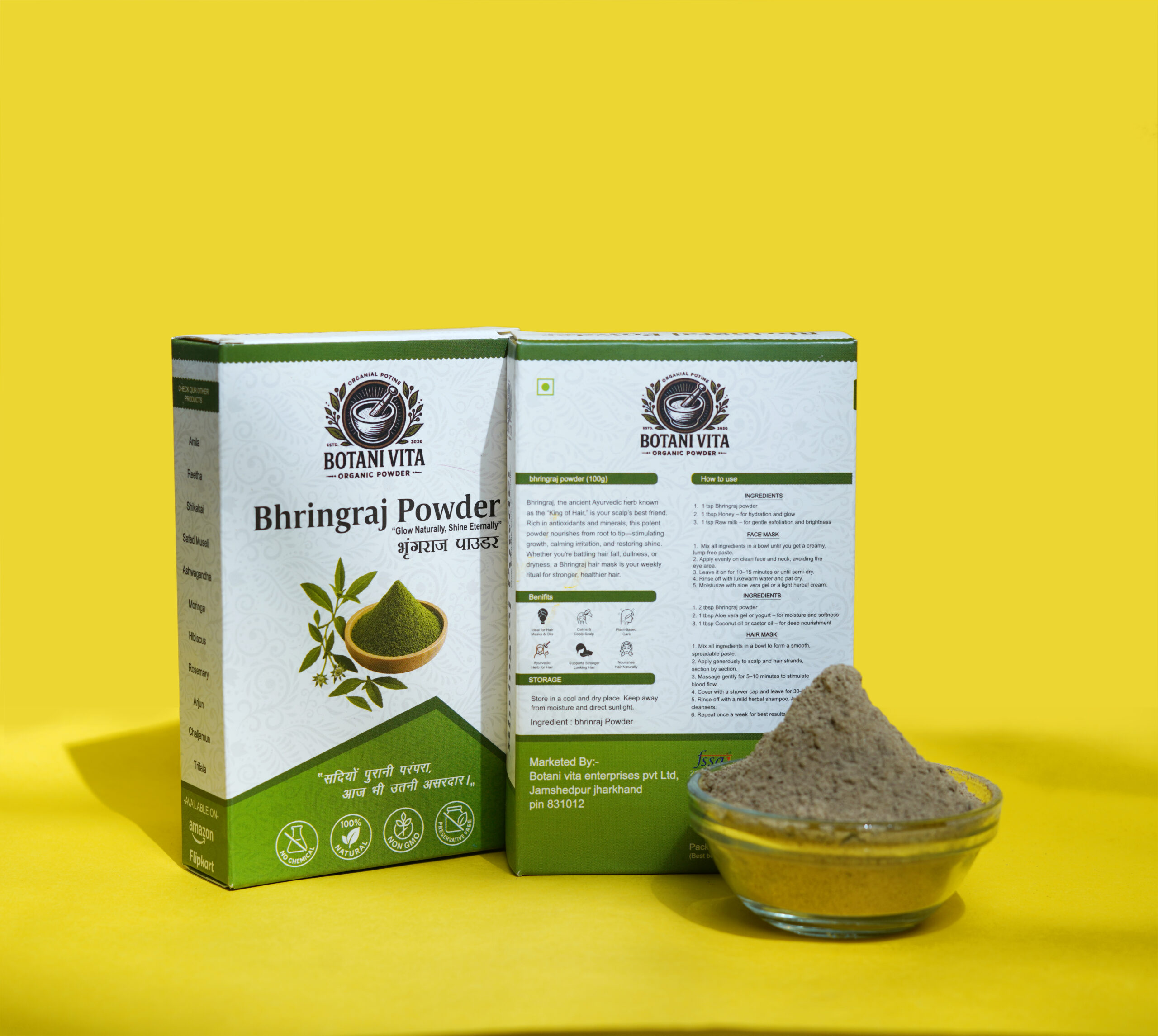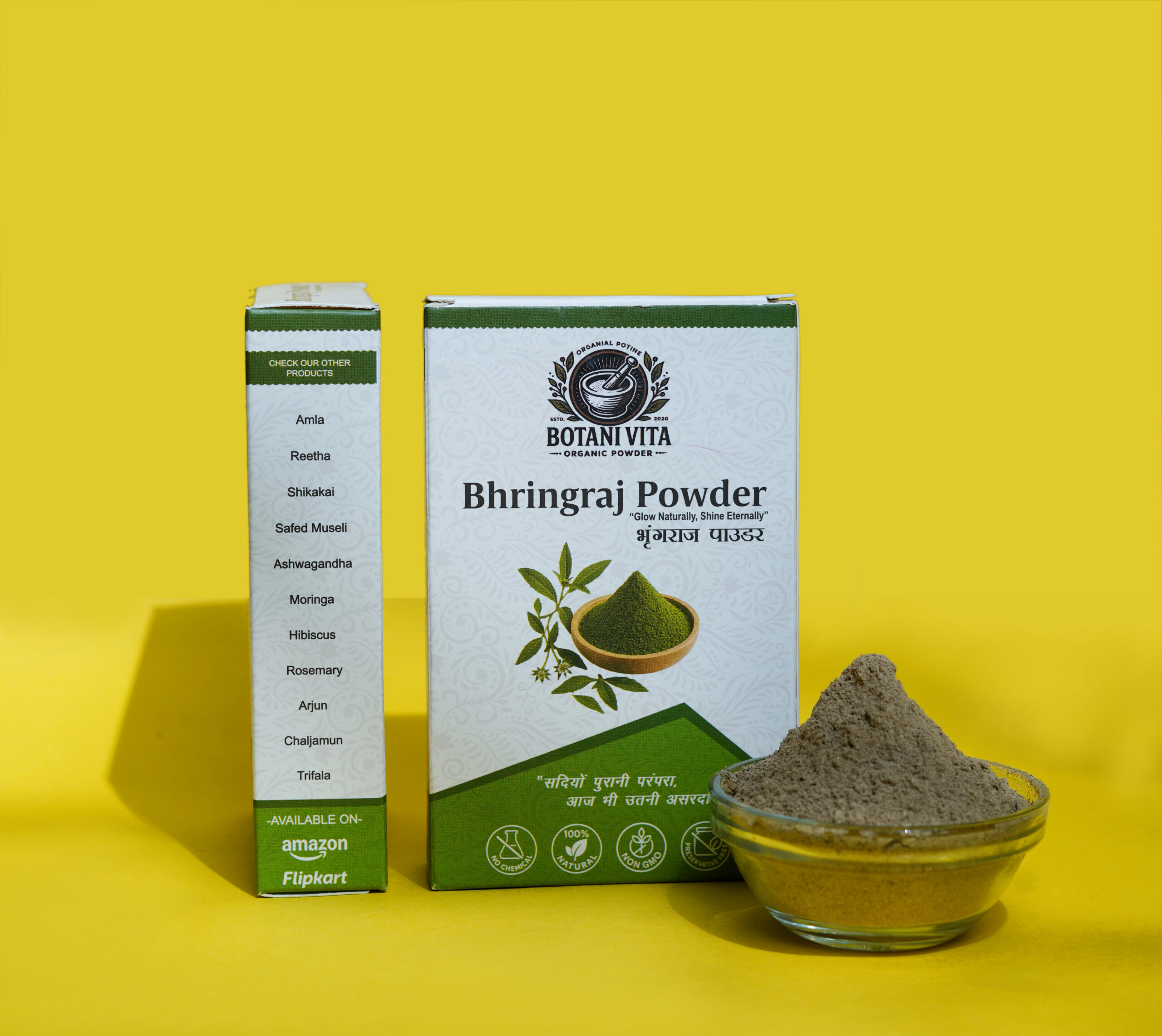 BotaniVita Bhringraj Powder is made from 100% naturally dried Bhringraj leaves, finely ground to preserve their active plant nutrients. Known as the “King of Herbs” in Ayurveda, Bhringraj has been traditionally used to strengthen hair roots, reduce hair fall, and support natural hair growth. Rich in antioxidants and essential nutrients, it also helps maintain scalp health and supports overall wellness. Free from additives, preservatives, and artificial colors, making it suitable for both external and internal use.