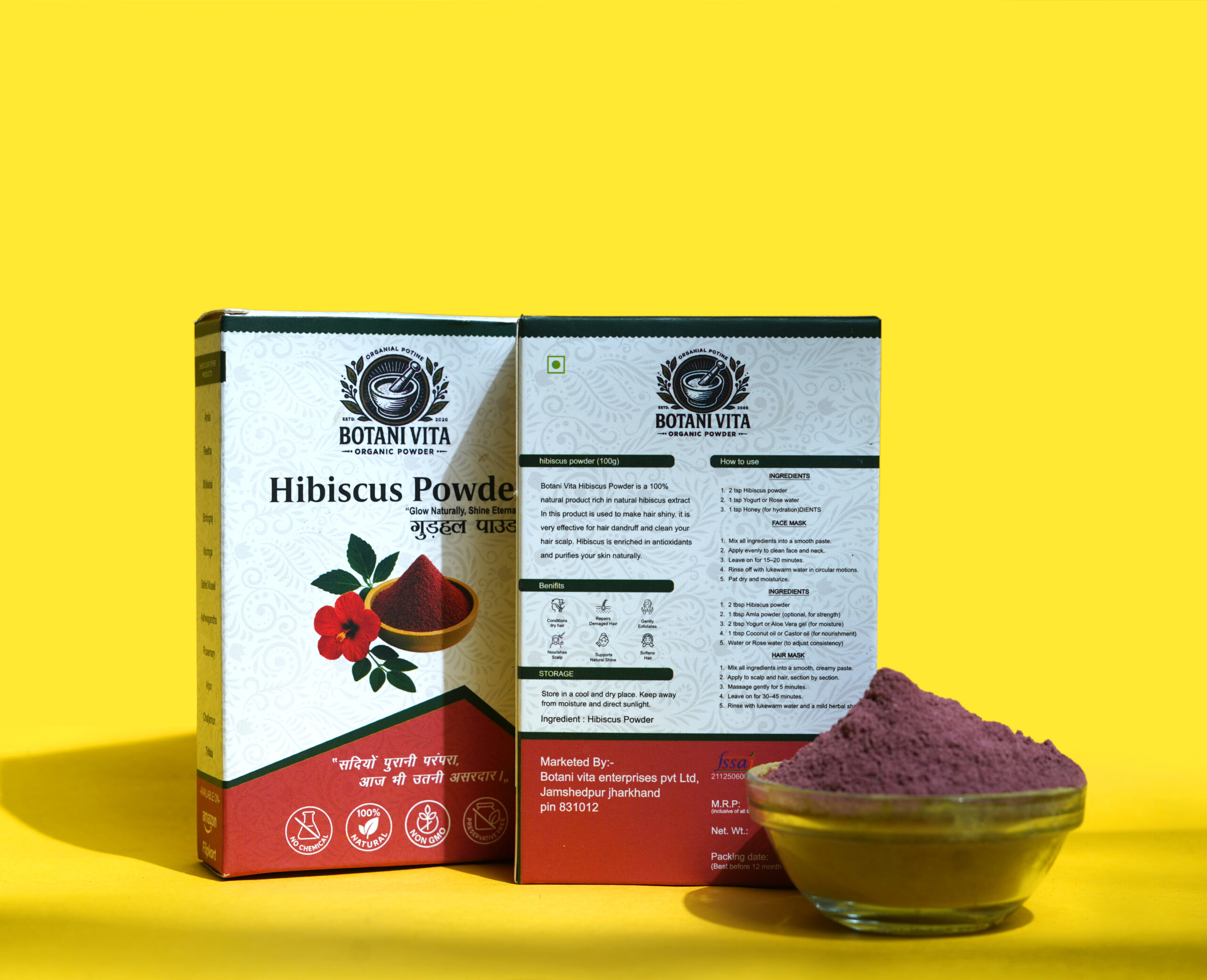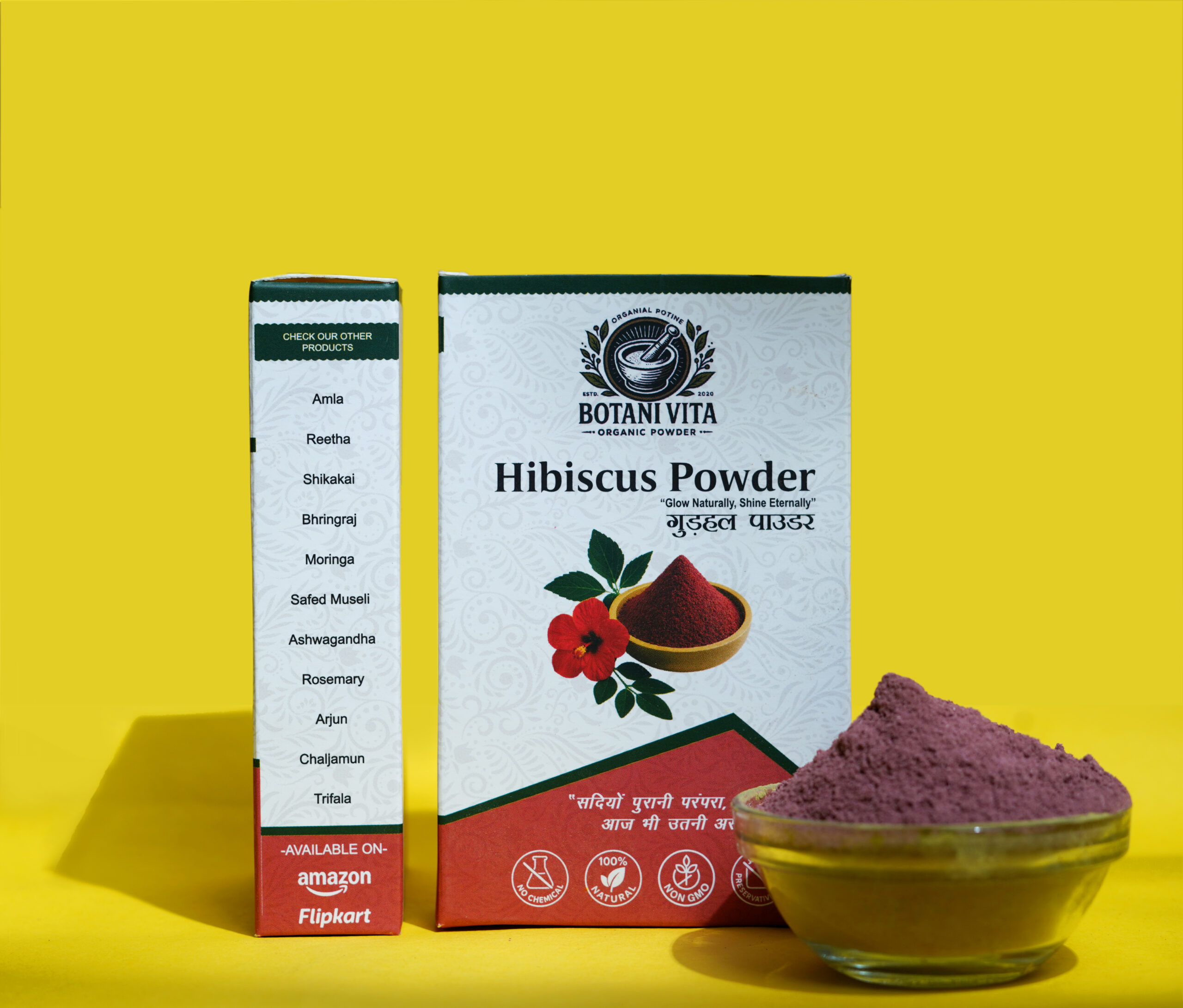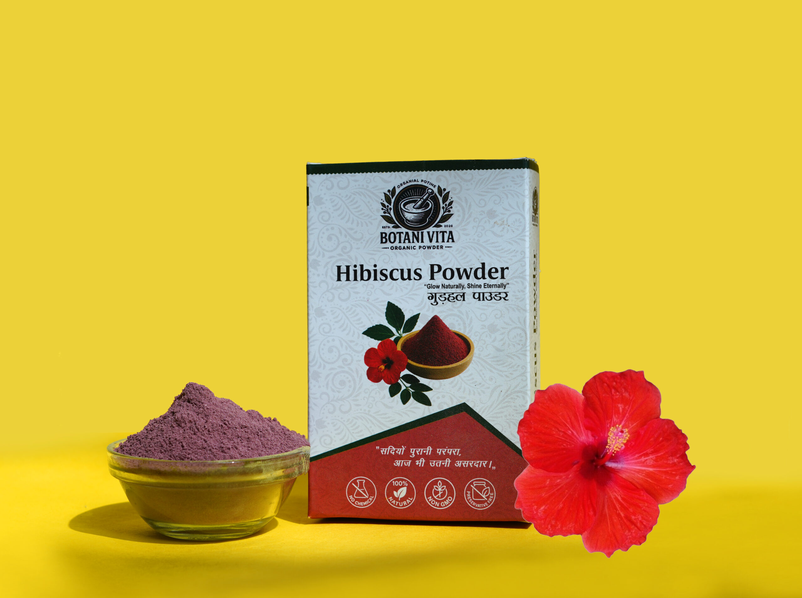 BotaniVita Hibiscus Powder is a pure, organic, chemical-free powder made from sun-dried hibiscus flowers. Rich in antioxidants and natural plant compounds, it supports healthy hair growth, helps reduce hair fall and dandruff, enhances hair shine, and promotes clear, healthy skin. Suitable for both external and internal use, with no additives or preservatives.